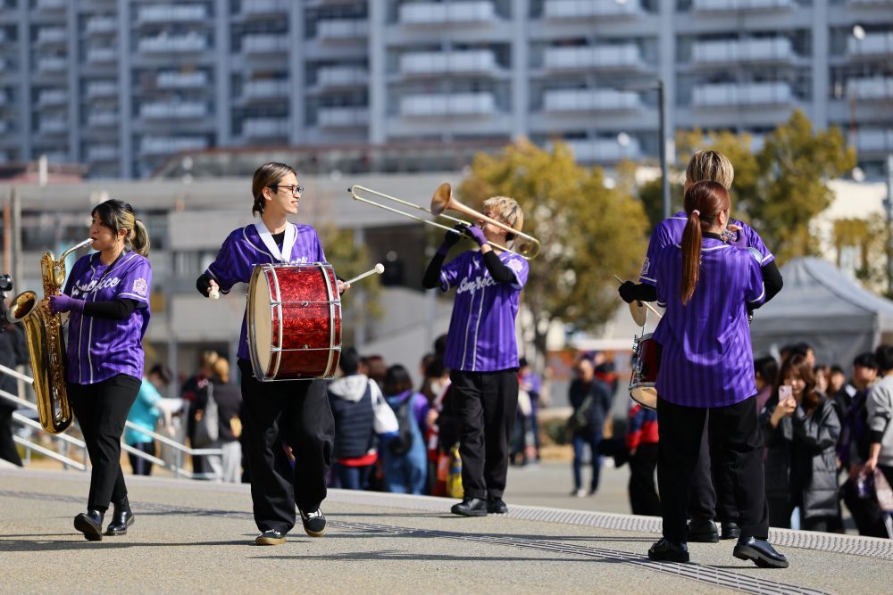 試合前の場外エリアで体験できるのは、特別編成の音楽隊「バイオレットビート」の生演奏と、サンチェ・フレッチェのグリーティングが一体になった「場外超熱狂グリーティング」。